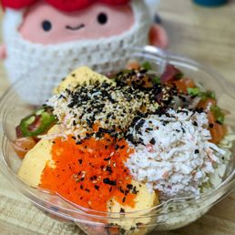 In a sort of sus are, but once you are inside, it is poke wonderland! I was honestly surprised by how much food you could get at the price point, and how fresh the fish was. I got the salmon and yellowtail, both of which were super fresh, and my friend also got the tuna which was really fresh too (despite not looking so). It's also crazy you get unlimited toppings, so you can really load up your bowl! It was absolutely delicious. The restaurant also serves miso soup on the counter for customers, which is a fun and nice little touch!